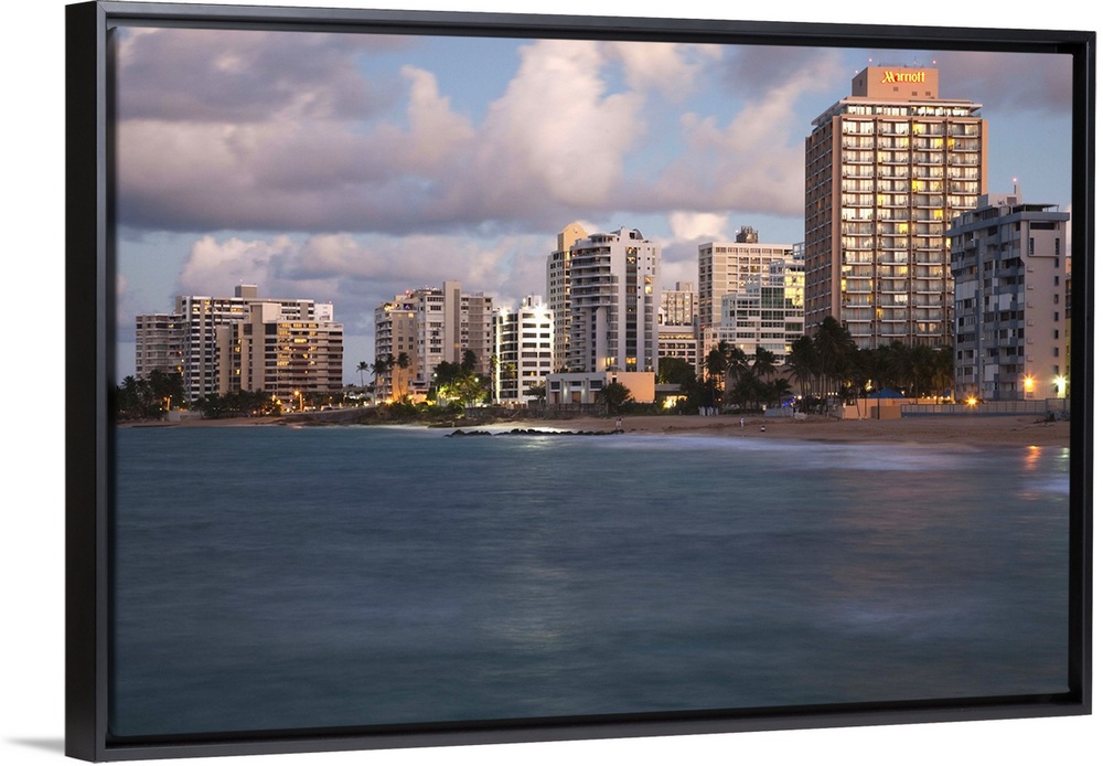 <p>Puerto Rico, San Juan, Condado, Condado high rise buildings and Condado Beach, dusk</p>