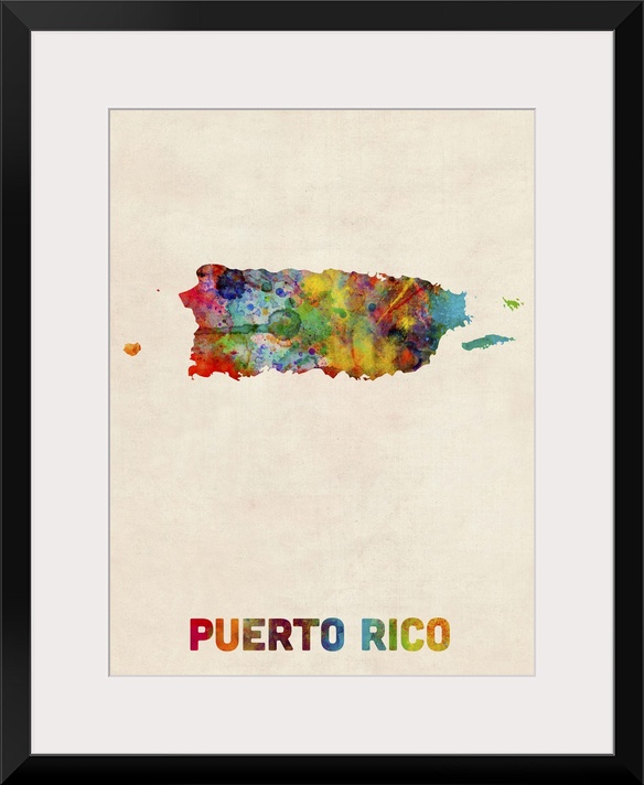 <p>Colorful watercolor art map of Puerto Rico against a distressed background.</p>