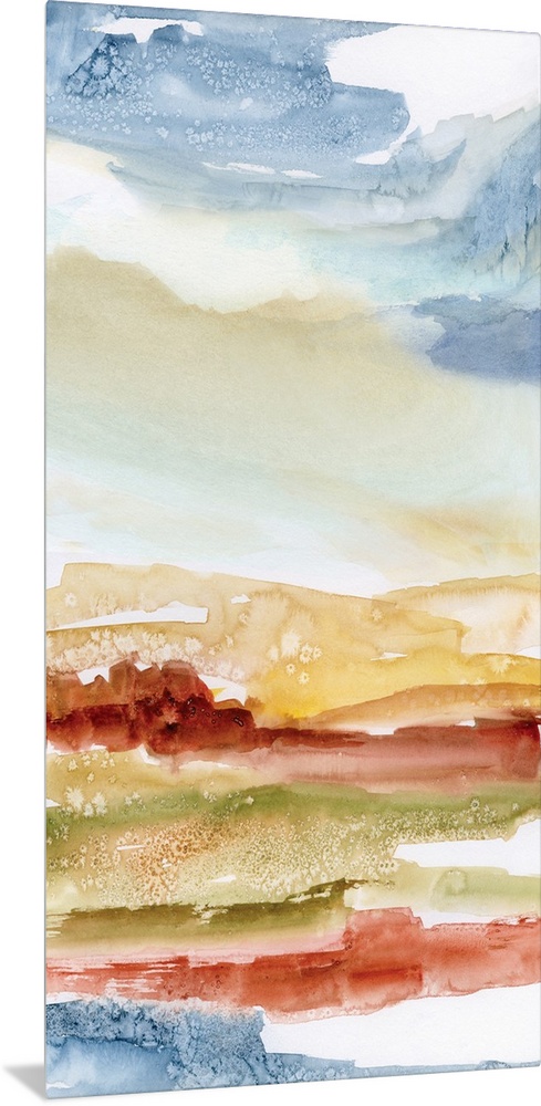 <p>Abstract watercolor painting in blue, red, and orange, resembling a desert landscape.</p>