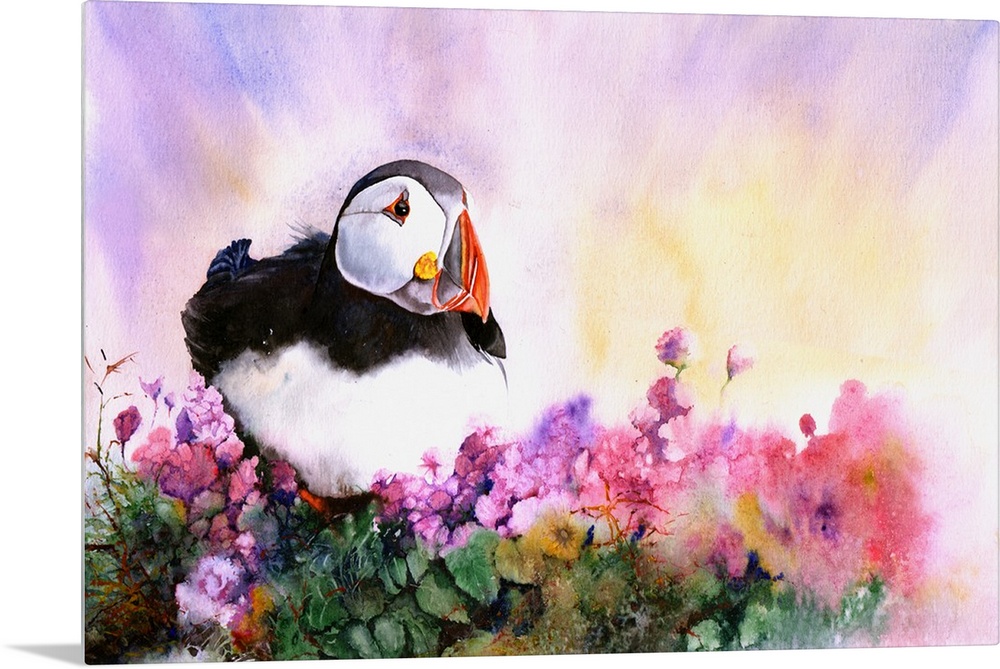 <p>Originally painted in watercolour, a little puffin settles among flowers and foliage.</p>