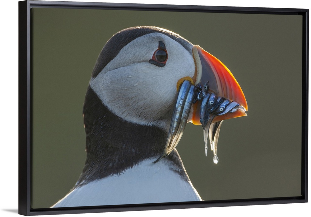<p>Puffin (Fratercula arctica) Portrait with sandeels, Isle of May, Firth of Forth, Scotland, UK</p>