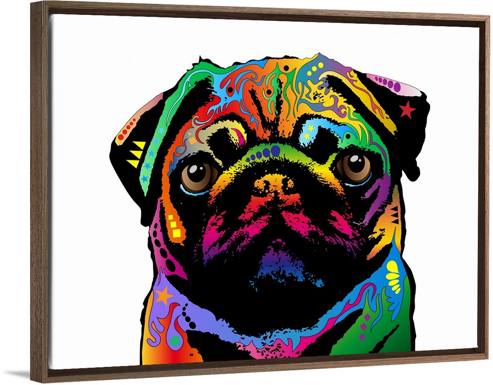 <p>Contemporary artwork of a Pug made up of a spectrum of bright colors.</p>