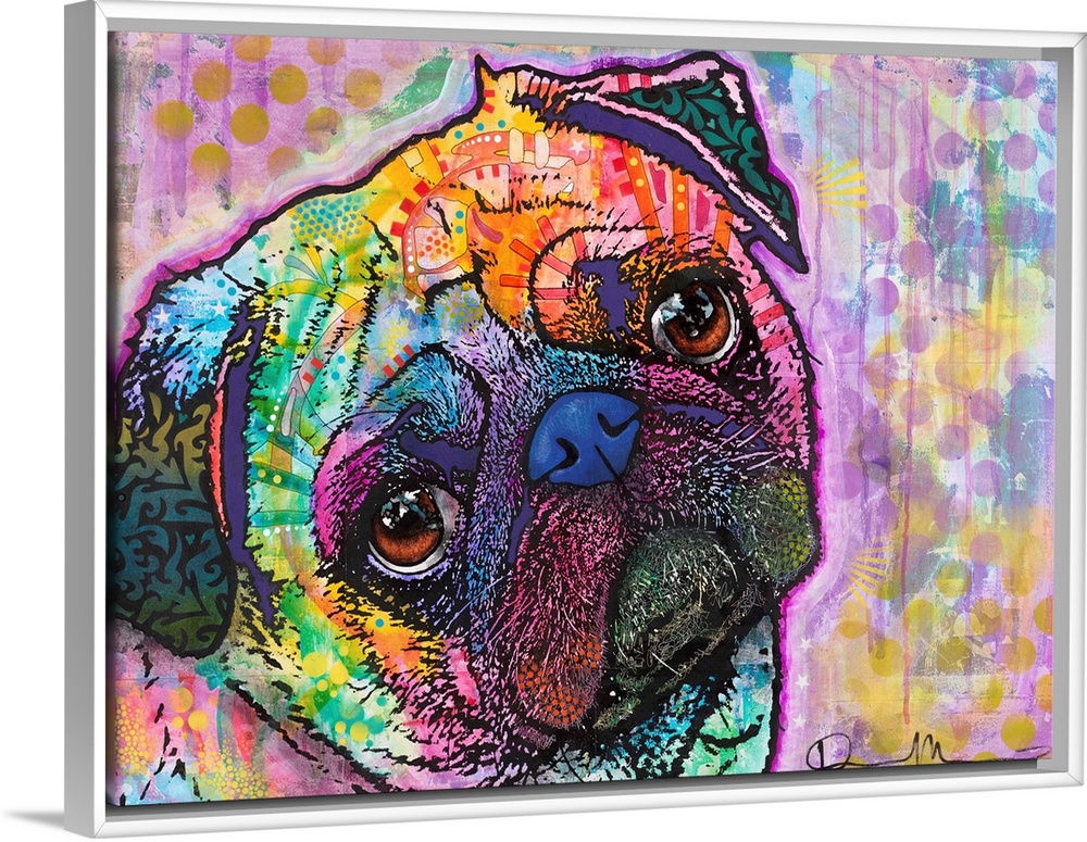 <p>Colorful illustration of a Pug with its head tilted and abstract markings all over.</p>