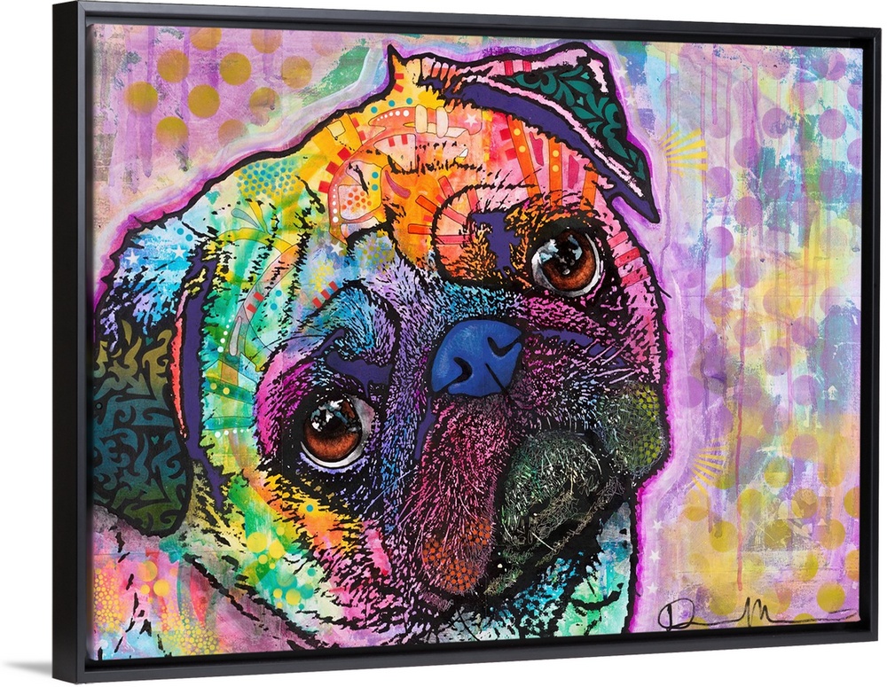 <p>Colorful illustration of a Pug with its head tilted and abstract markings all over.</p>