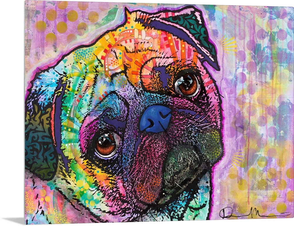 <p>Colorful illustration of a Pug with its head tilted and abstract markings all over.</p>