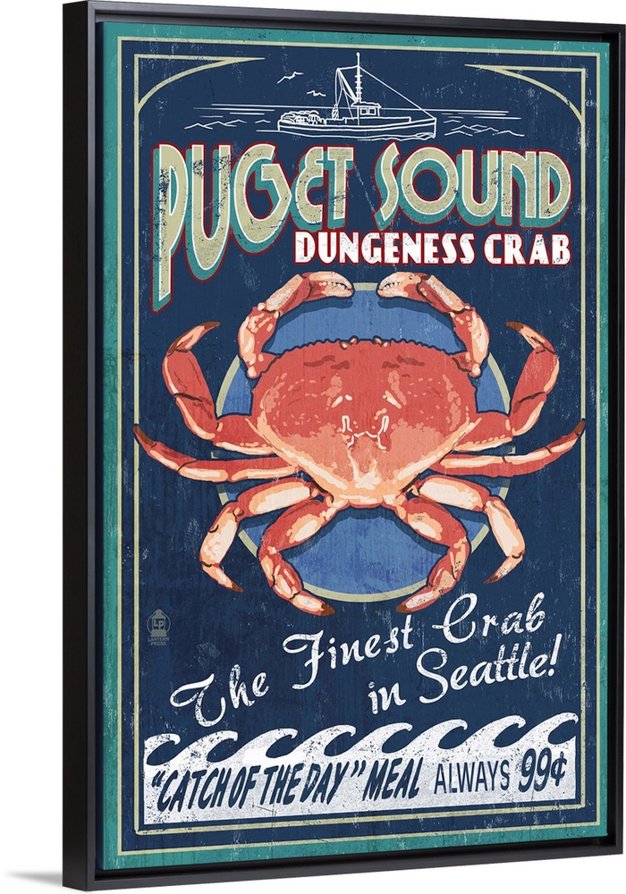 <p>Retro stylized art poster of a vintage seafood market sign displaying a king crab.</p>