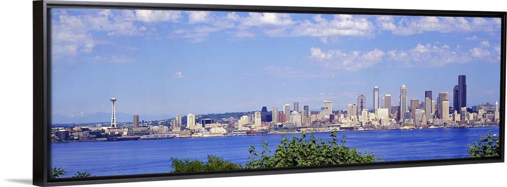 <p>A panoramic photograph is taken of the Seattle skyline across a large body of water with foliage at the bottom of the picture.</p>