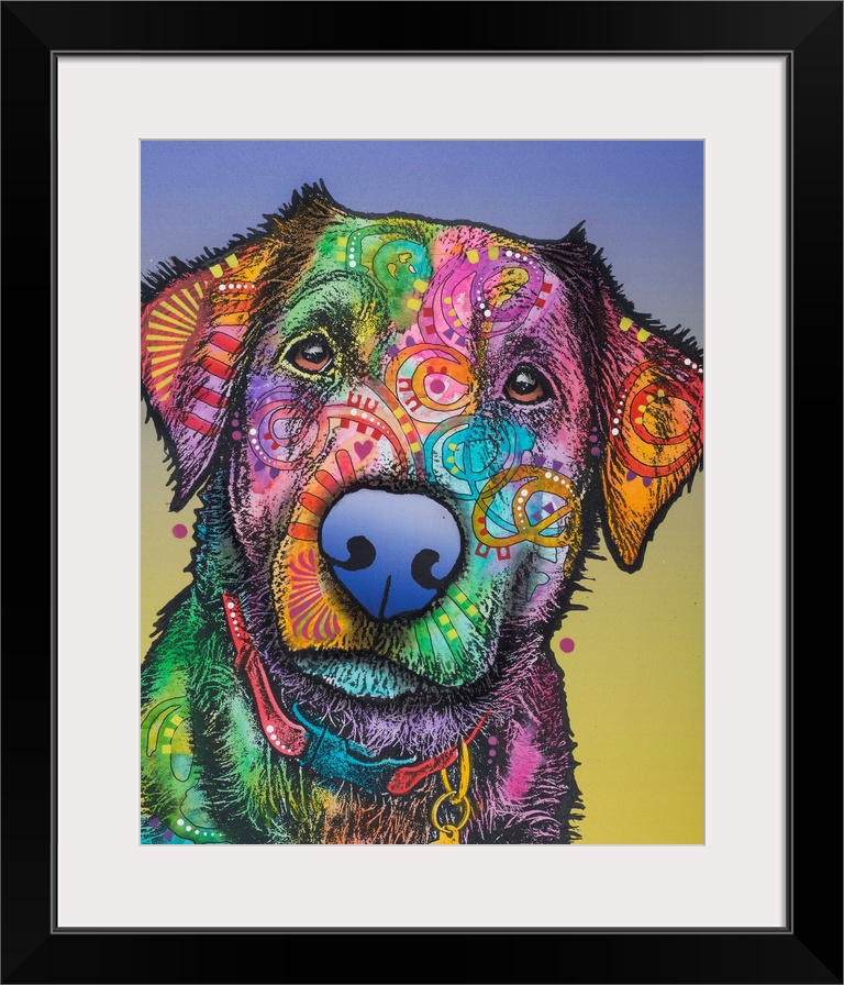 <p>Pop art style painting of a colorful Labrador with graffiti-like designs on a blue and yellow background.</p>