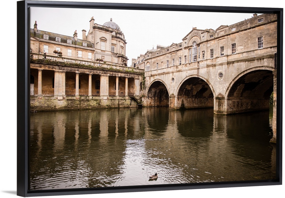 <p>Photograph of three arched tunnels connected to the Pulteney Bridge in Bath, England, with a duck swimming in the foreground on the River Avon.</p>