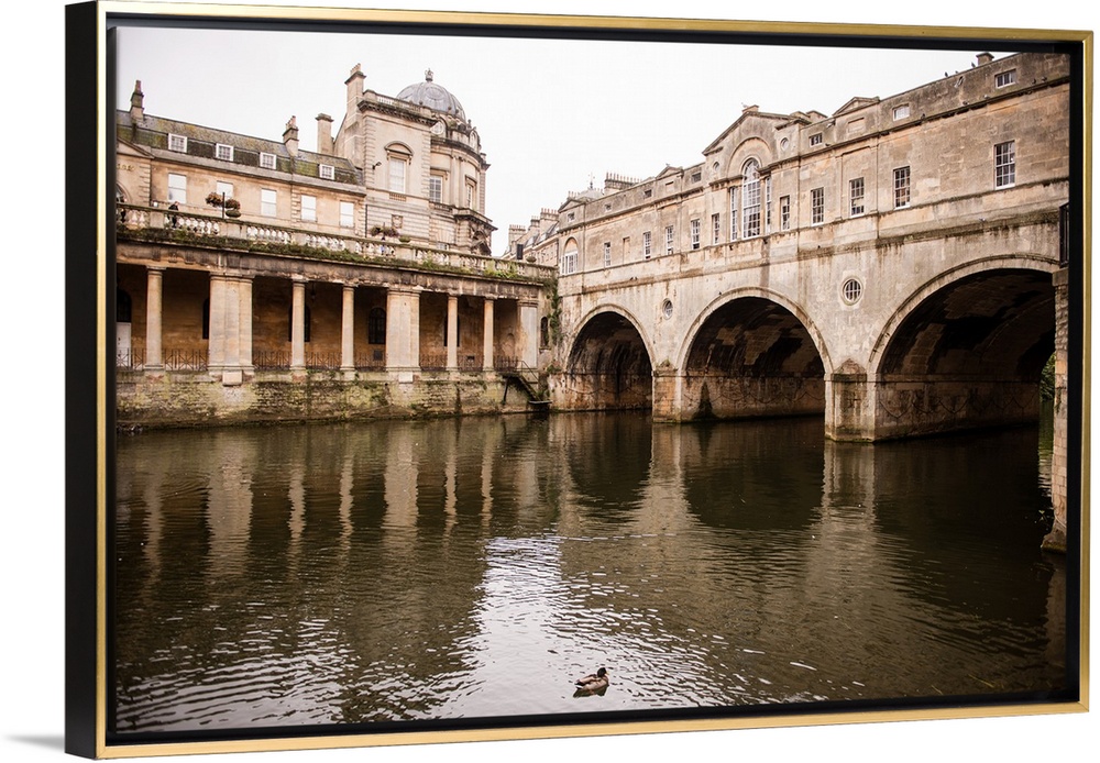<p>Photograph of three arched tunnels connected to the Pulteney Bridge in Bath, England, with a duck swimming in the foreground on the River Avon.</p>