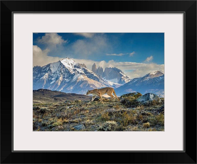 <p>Winter scene, Puma (Puma concolor) walking in front of the Towers in Torres del Paine National Park Patagonia, Chile</p>