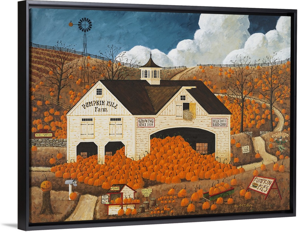 <p>Americana scene of a white barn overflowing with pumpkins.</p>