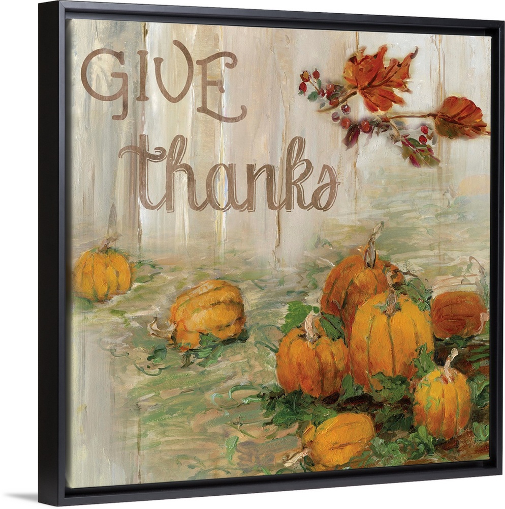 <p>"Give Thanks" written on a square canvas with illustrated pumpkins in a pumpkin patch and Fall leaves.</p>