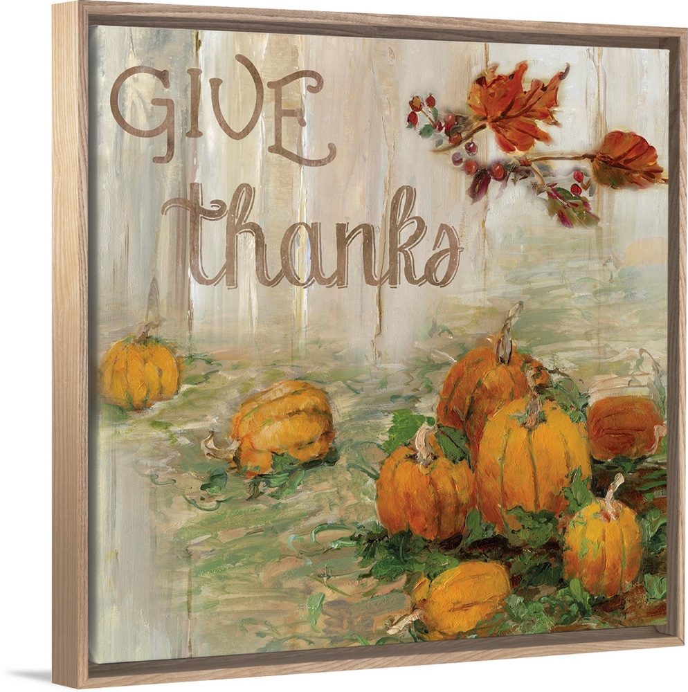 <p>"Give Thanks" written on a square canvas with illustrated pumpkins in a pumpkin patch and Fall leaves.</p>