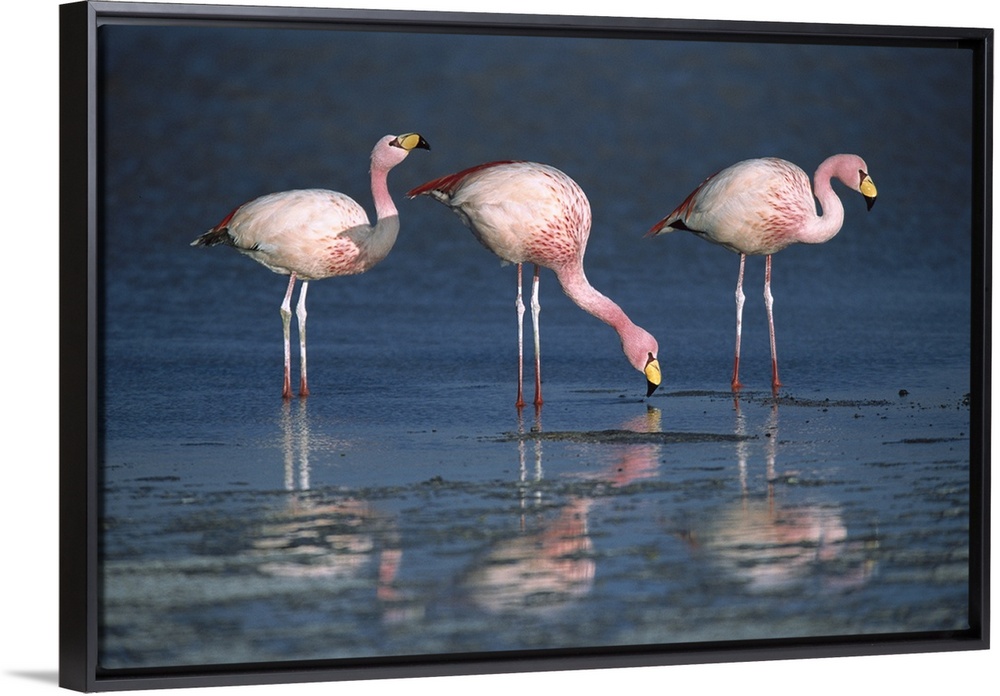 <p>Puna Flamingo (Phoenicopterus jamesi) rare, three drinking from freshwater springs along lake edge, Laguna Colorada, Andean altiplano above 4,000 meters elevation, Bolivia</p>
