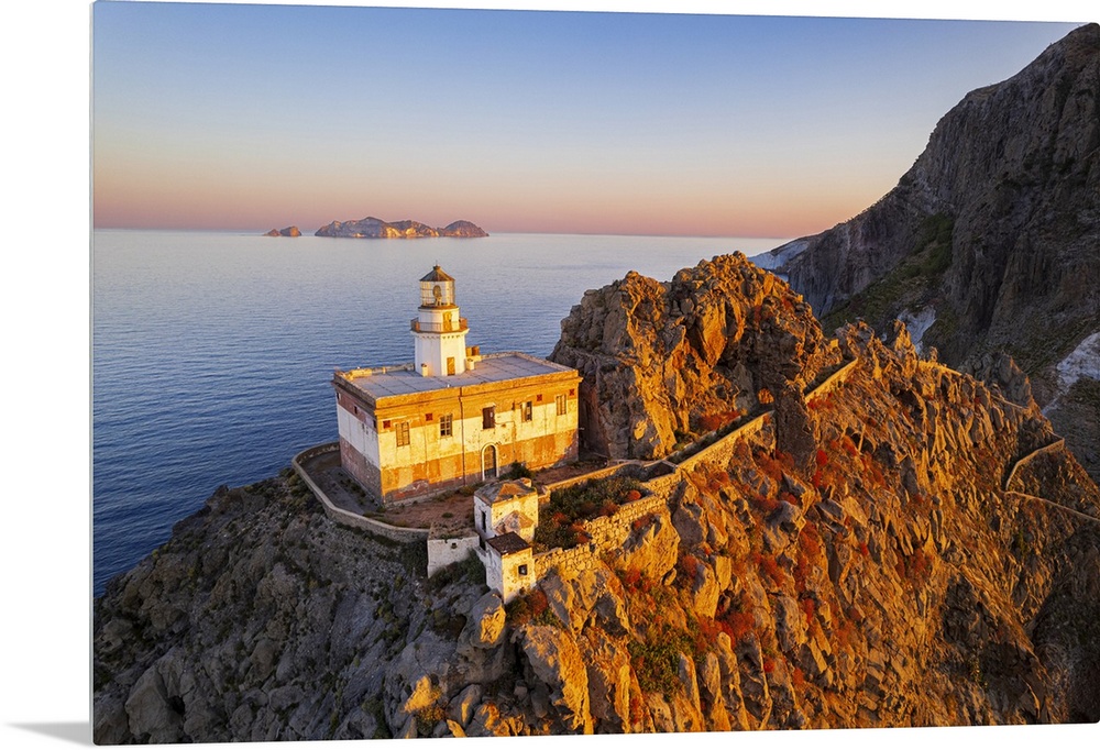<p>Aerial view of Punta della Guardia lighthouse on top of a cliff on the island of Ponza, lit from sunrise, Ponza island, Pontine islands, Mediterranean Sea, Latium, Lazio, Italy, Europe</p>