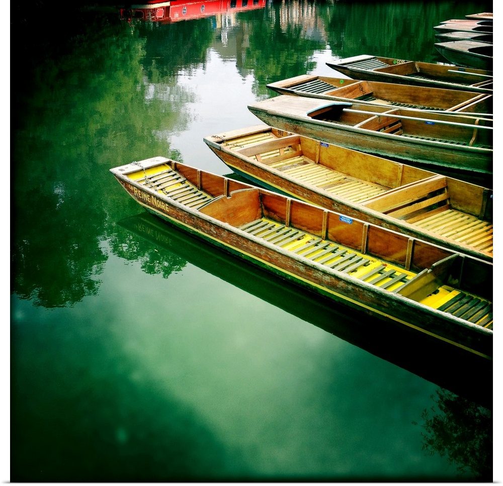 <p>Punts moored by river bank, Cambridge, Cambridgeshire, England</p>