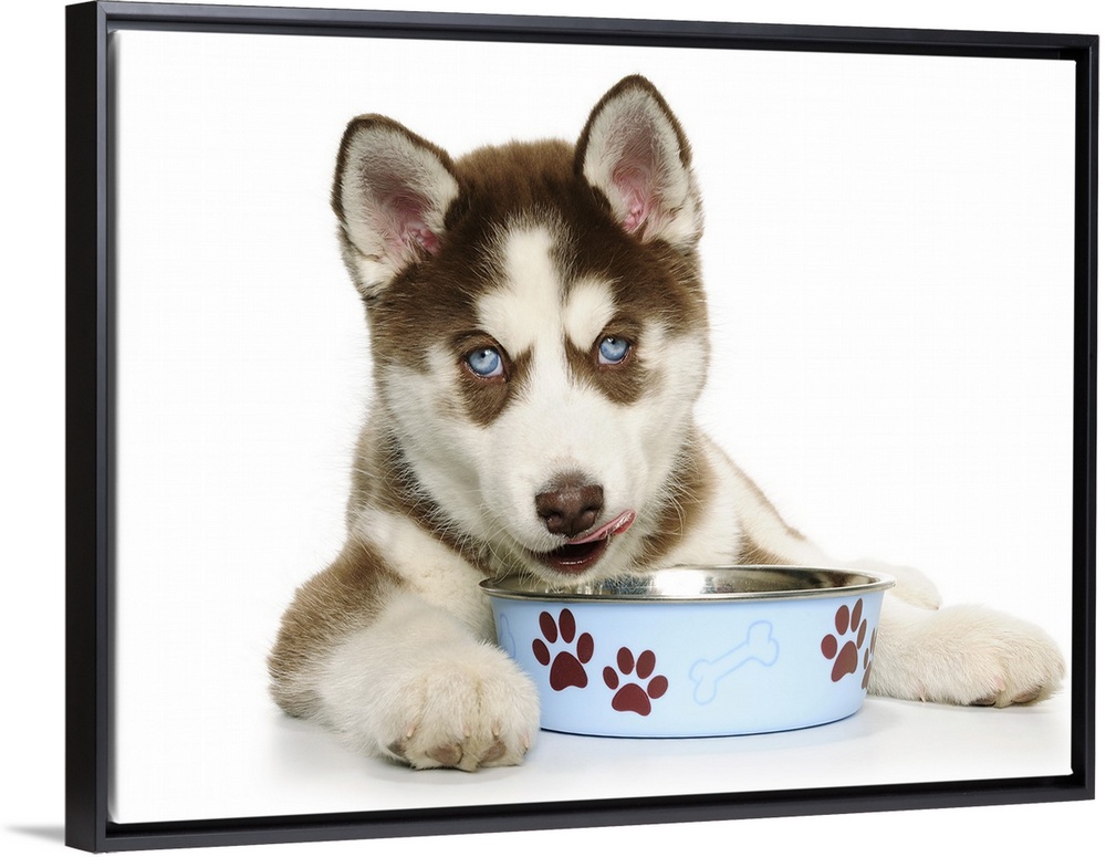 <p>Happy Holiday Christmas cute Brown and White Siberian Husky Puppy laying down and eating out of his blue food dish with brown paw prints on the side of the dish</p>