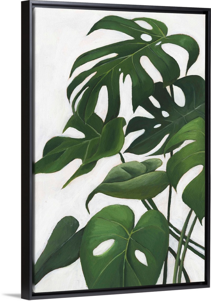 <p>Artwork featuring luscious leaves against a mottled background with gray and off-white brush strokes.</p>