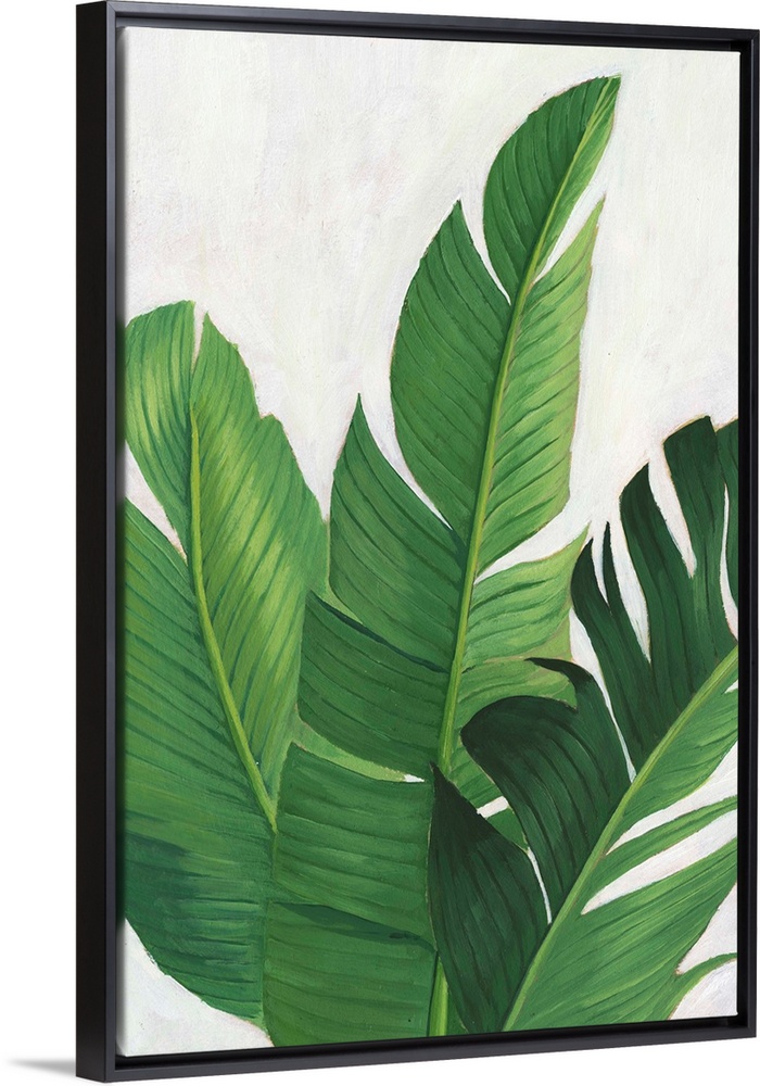 <p>Artwork featuring luscious leaves against a mottled background with gray and off-white brush strokes.</p>