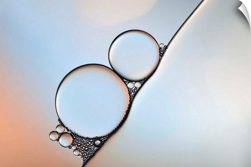 <p>Closeup photograph of large and tiny drops of oil in water with faded hues of blue and orange in the background.</p>