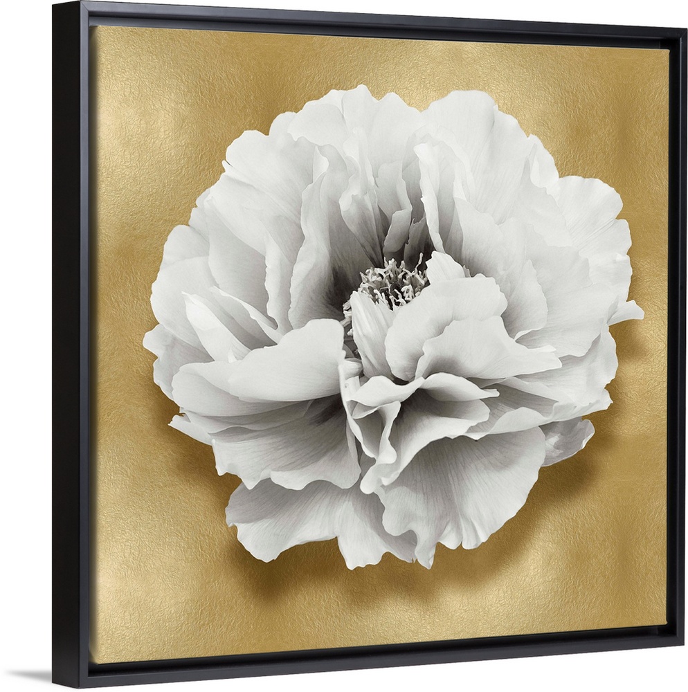 <p>Square decor with a white carnation flower on a gold background.</p>