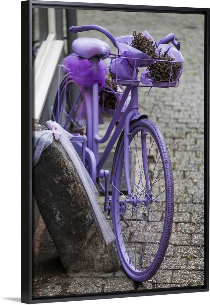 <p>Purple bicycle on street, Limburg an der Lahn, Hesse, Germany</p>