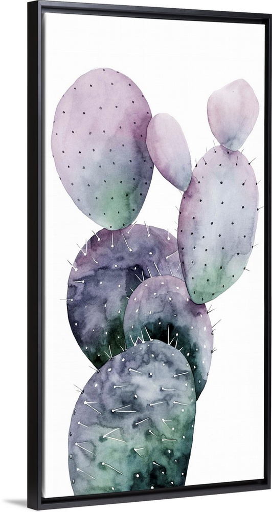 <p>Watercolor painting of a purple and green toned cactus on a white panel background.</p>