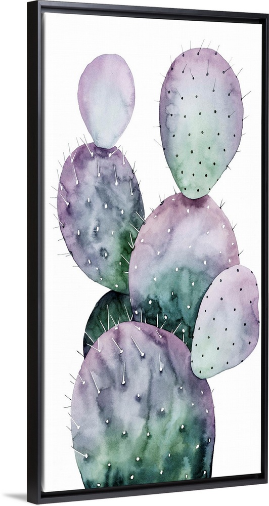 <p>Watercolor painting of a purple and green toned cactus on a white panel background.</p>