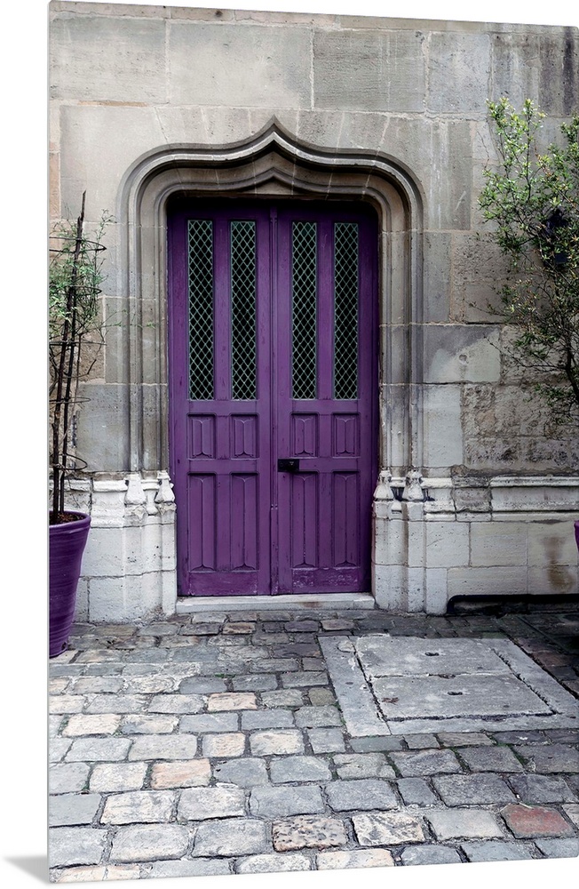 <p>Fine art photograph of a purple door in a stone wall on a cobblestone street.</p>