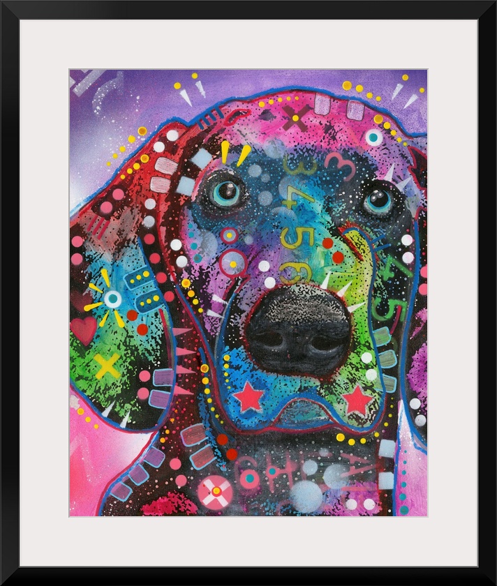 <p>Colorful painting of a Pointer with geometric abstract markings all over on a pink and purple background.</p>