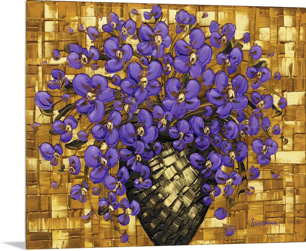 <p>Contemporary painting of purple flowers in a black and gold vase with a textured gold background created with layered squares.</p>