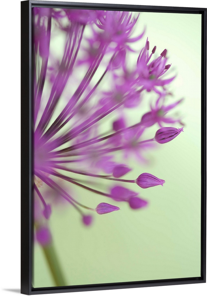 <p>A closely taken photograph of a purple allium flower. Parts of the plant appear out of focus.</p>