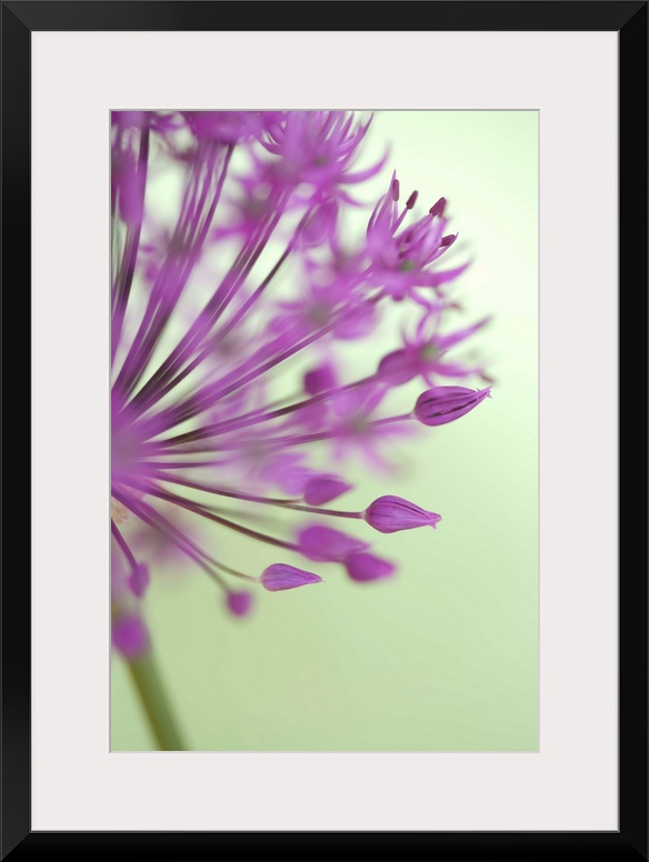 <p>A closely taken photograph of a purple allium flower. Parts of the plant appear out of focus.</p>