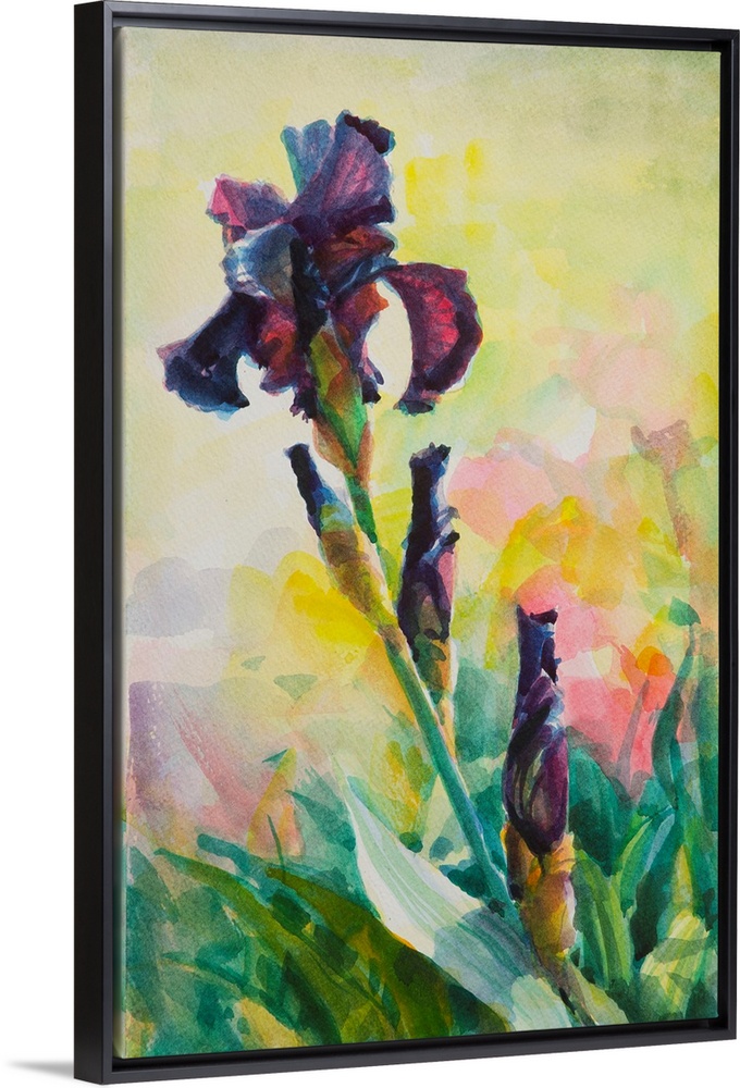 <p>Traditional impressionist watercolor painting of a blooming purple beaded iris in a spring country garden</p>