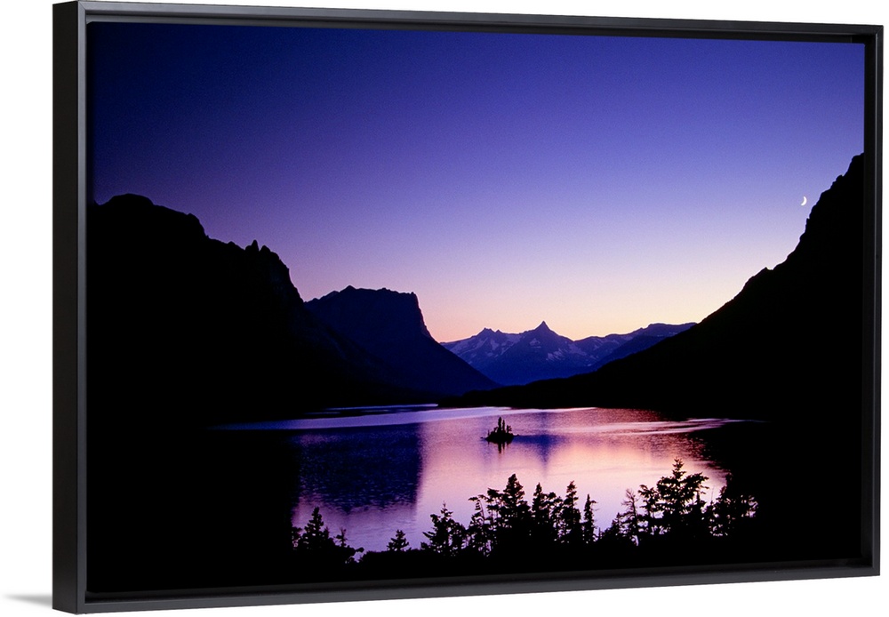 <p>Mountainous terrain is silhouetted by the sunset and a large body of water sits in between. A small crescent moon is shown just above the mountains.</p>