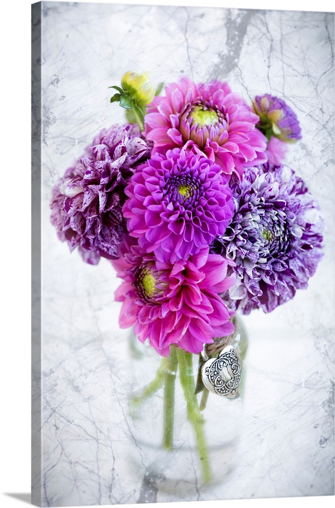 <p>Purple marbled dahlia's arranged in a glass jar on a marble counter</p>