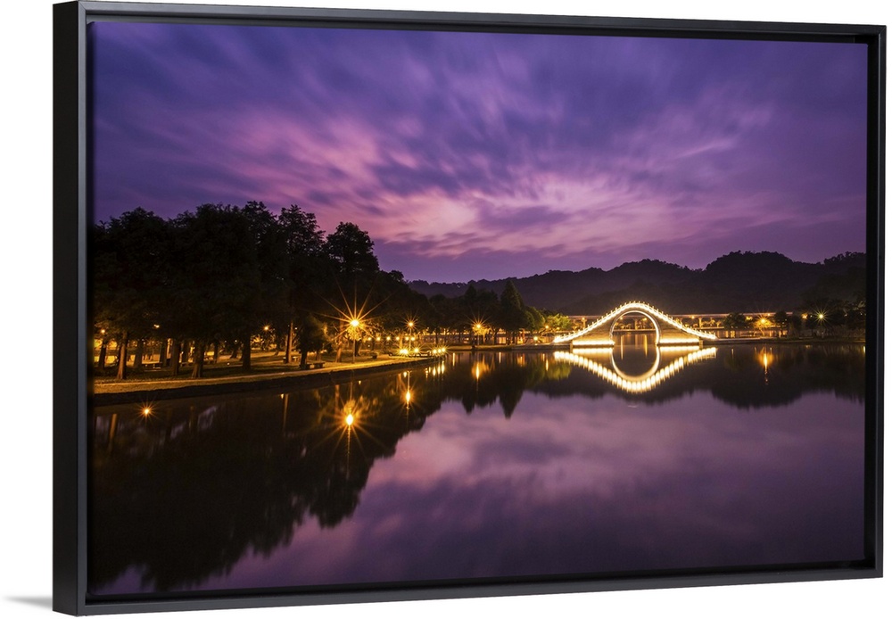 <p>Purple tone prior to sunrise with light up arch bridge and its reflection in the water.</p>