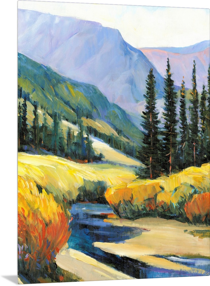 <p>Contemporary painting of a mountain valley landscape with a small river and pine trees.</p>
