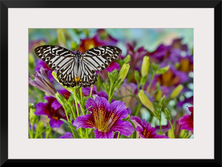 <p>Purple painted tongue flowers and black striped tropical butterfly.</p>