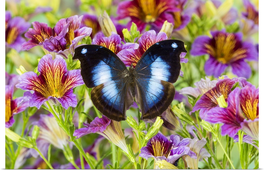 <p>Purple painted tongue flowers with tropical butterfly Napocles jucunda</p>