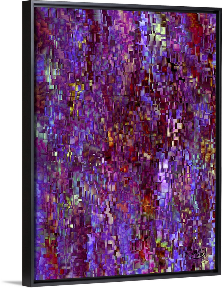<p>Square abstract piece with tiny solid rectangles layered on each other to create a cracked look with mostly purple and blue hues.</p>