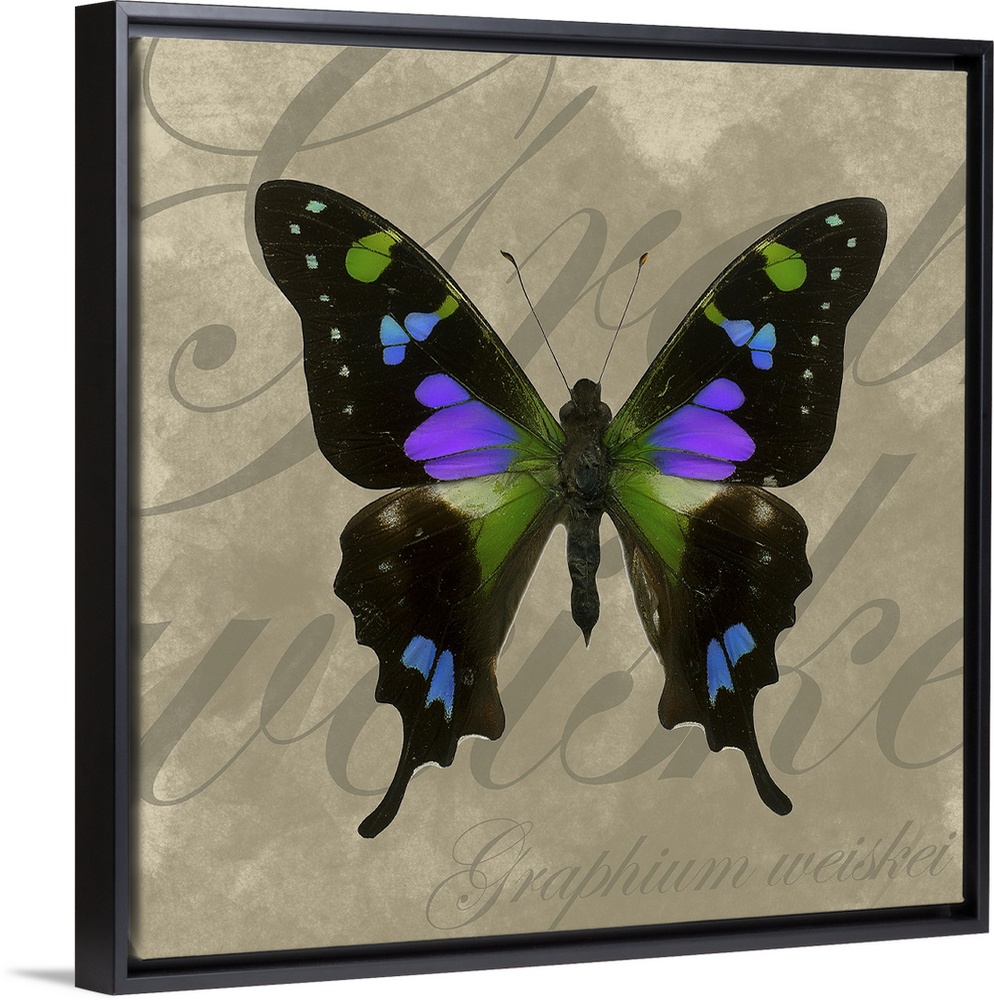 <p>Multi colored butterfly with outstretched wings on a neutral text background.</p>
