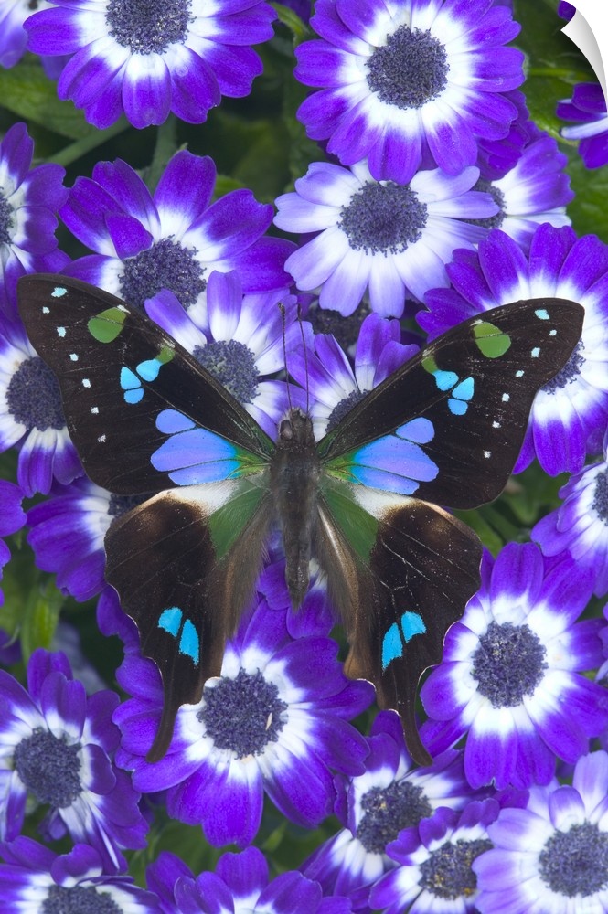 <p>Sammamish, Washington, Purple Spotted Swallowtail Butterfly (Graphium weiskei) on flowers.</p>