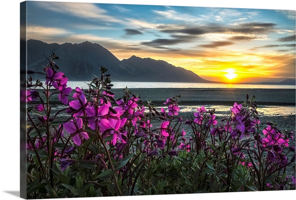 <p>Purple Vetch (Vicia americana) blooms along the shores of Kluane Lake with sunset happening in the distance; Yukon, Canada</p>
