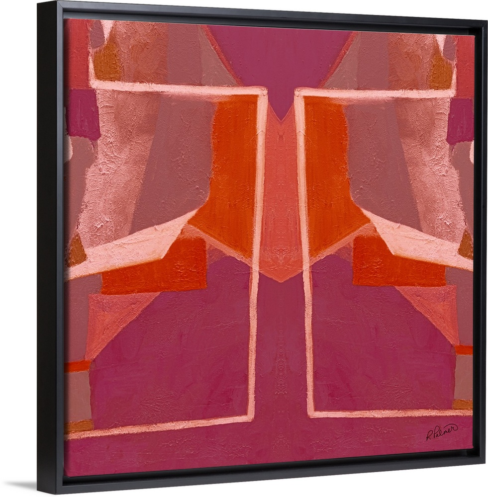 <p>Square abstract painting with pink and orange symmetrical designs.</p>