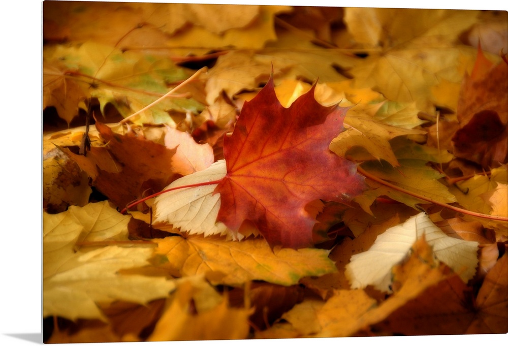 <p>Soft focus in a close up of leaf contrasting with the other leaves it has fallen on top of in this horizontal, nature photograph.</p>
