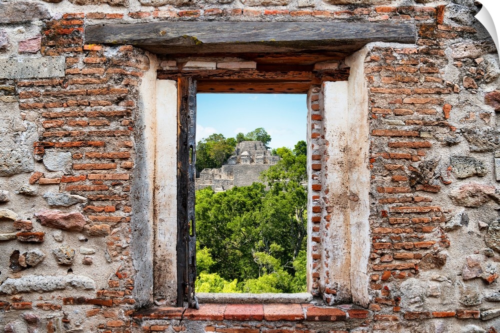 <p>View of the Mayan Pyramid in the city of Calakmul, Mexico, framed through a stony, brick window. From the Viva Mexico Window View.</p>