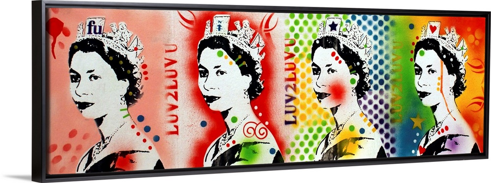 <p>Panoramic graffiti-like print with four images of Queen Elizabeth in a row with different spray painted backgrounds.</p>