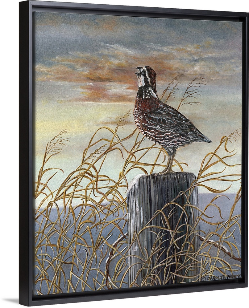 <p>Contemporary painting of a quail standing on a wooden post under a sunset sky.</p>